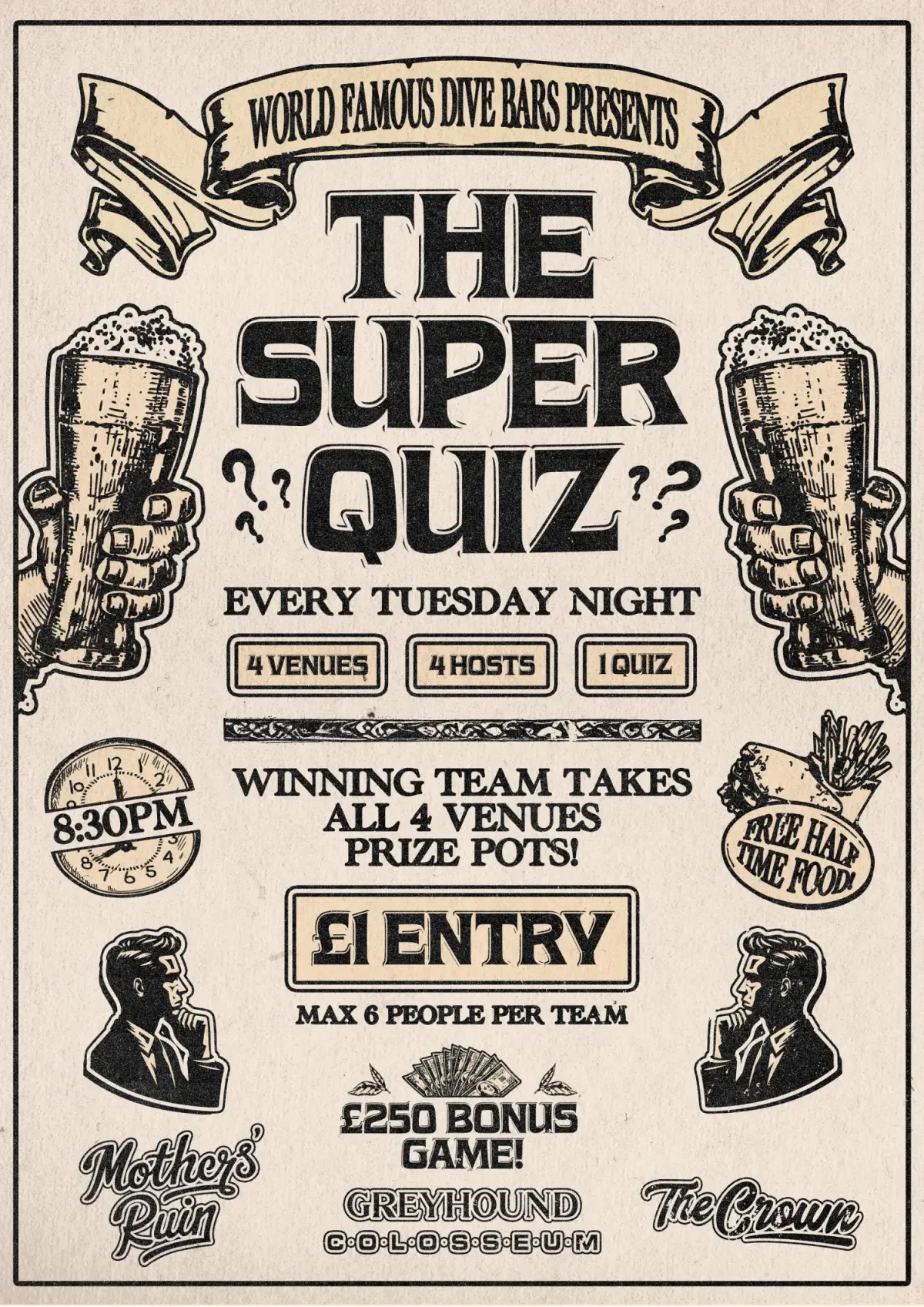 Looking for the best quiz in Bristol? You’ve just found it. The World Famous Super Quiz is the biggest, most exciting pub quiz in the city – running simultaneously across The Colosseum, The Greyhound, The Crown, and The Mothers’ Ruin.